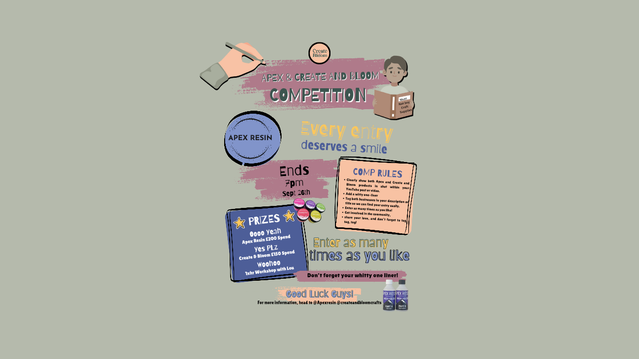 To enter, simply show us how you use Apex resins alongside Create and Bloom glitters, pigments, or moulds in your craft projects. Whether it’s bold resin art, stunning home décor, sparkling jewellery, or something completely unexpected!