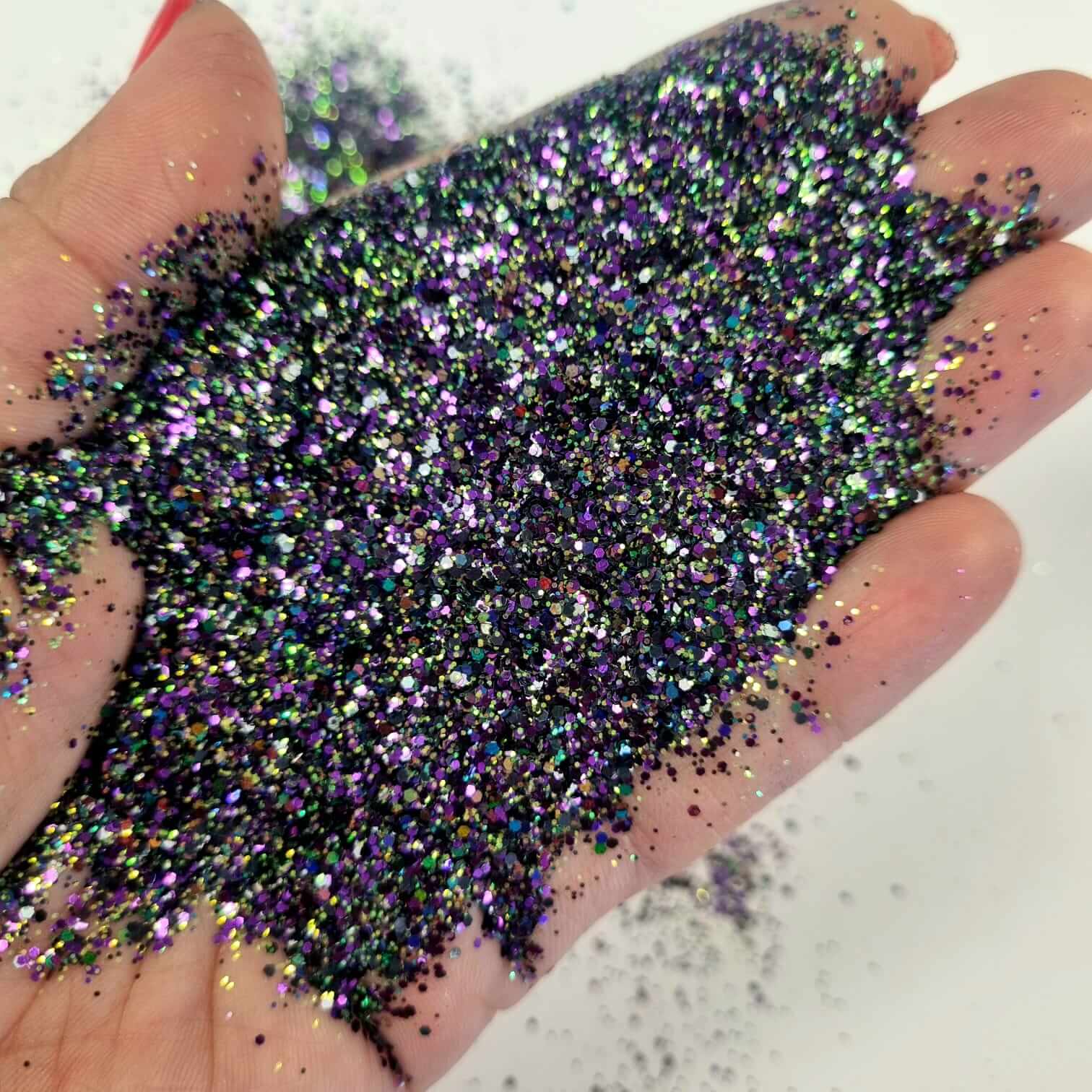 - 56g of green, black, and purple tiny hex glitter dust (1mm flake)