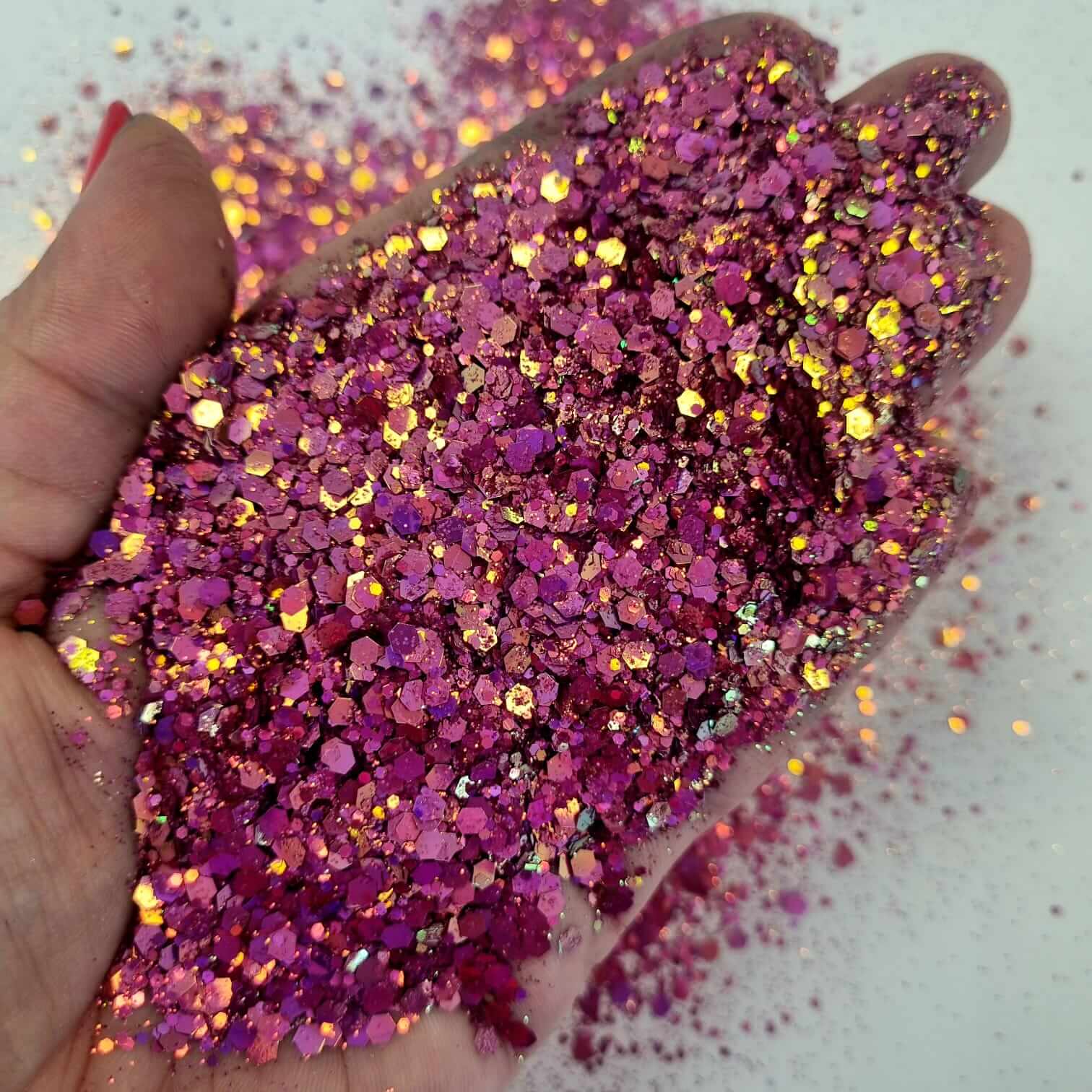 - 56g of chunky cerise pink hex glitter with a golden shift