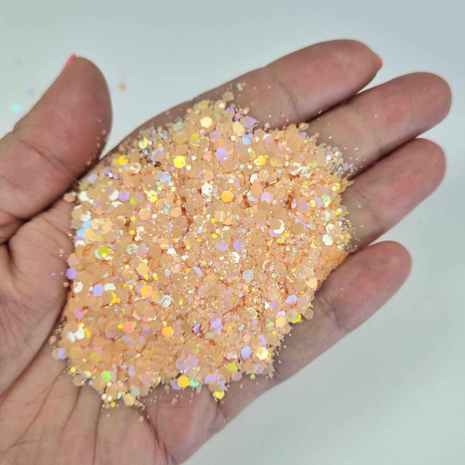 A luscious blend of soft coral tones , this glitter radiates warmth and effortless charm. The chunky hex cuts shimmer like sunlight on silk, catching the light with every move and delivering that sweet, peachy pop your projects have been craving.