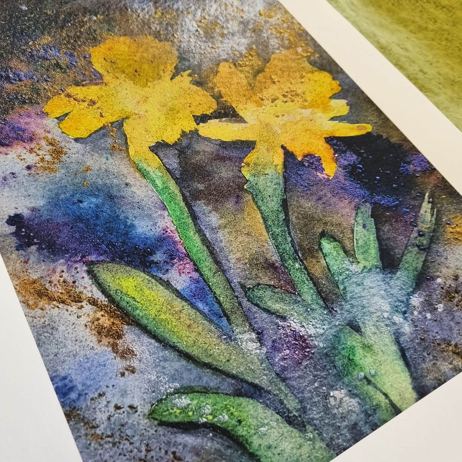 Giclee printed from an original watercolour painting of daffodils growing in my Cotswold garden. Using shades of cadmium and lemon yellow, turquoise, violet and Payne's grey, this picture is painted in an expressive & playful style and is signed by me.