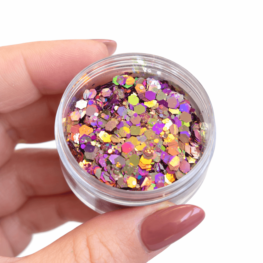 - Chunky glitter mix with multi-sized hex shapes
